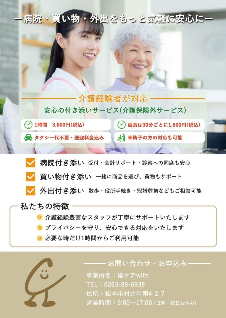 安心の付き添いサービスはじめました! 2025 10/04 お知らせ 2025年10月4日2025年11月5日 新サービスのご案内です♪ 「通院やお買い物、冠婚葬祭など、外出にお困りの方の力になりたい!」そんなスタッフさんの声から生まれたサービスです。 優ケアのご利用者様以外でもお受けしています。お困りの方がいらっしゃいましたら、お気軽にご相談ください☺ お知らせ よかったらシェアしてね! ホットケーキ作り🍰 11月のカルチャーは🎄スノードーム🎄です 関連記事 年末年始休業のお知らせ 2024年12月27日 優ケア壁面アート 2024年3月18日 年末年始休業のお知らせ 2023年12月14日